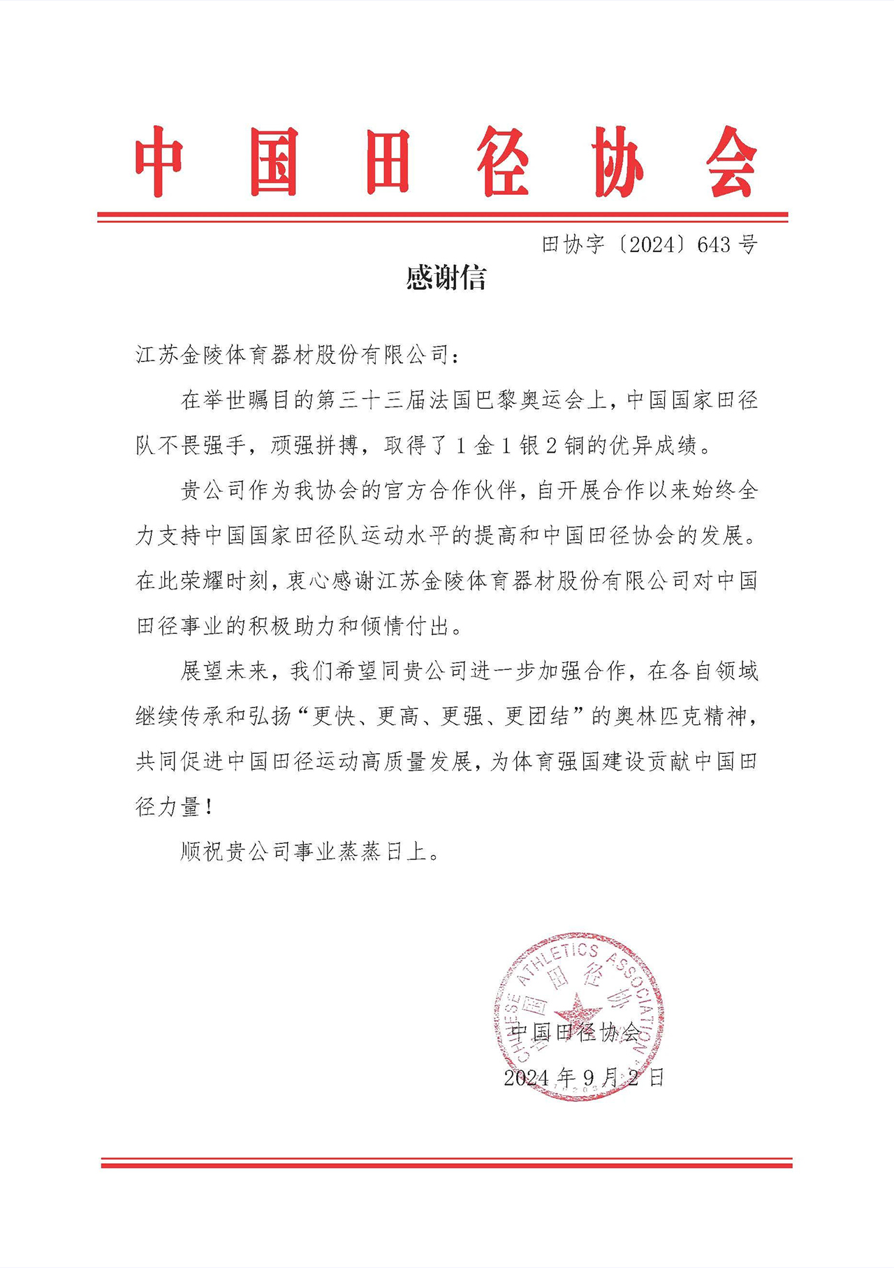 近日,中國田徑協會向金陵體育發來感謝信,感謝金陵體育為中國國家田徑隊奧運爭光做出的貢獻。