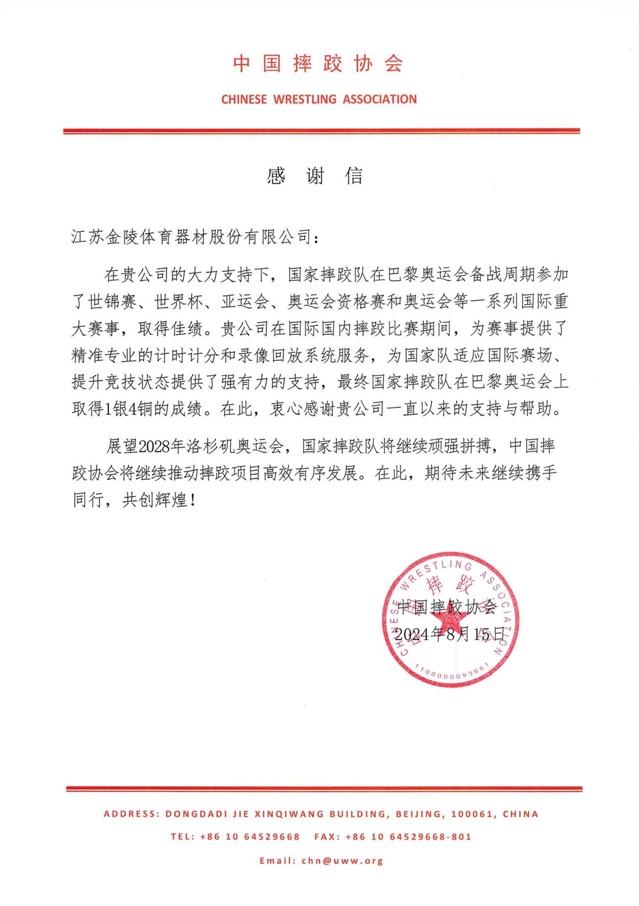 信中說:在貴公司的大力支持下,國家摔跤隊在巴黎奧運會備戰周期參加了世錦賽、世界杯、亞運會、奧運會資格賽和奧運會等一系列國際重大賽事,取得佳績。貴公司在國際國內摔跤比賽期間,為賽事提供了精準專業的計時計分和錄像回放系統服務,為國家隊適應國際賽場,提升競技狀態提供了強有力的支持,最終國家摔跤隊在巴黎奧運會上取得1銀4銅的成績。在此,衷心感謝貴公司一直以來的支持與幫助。