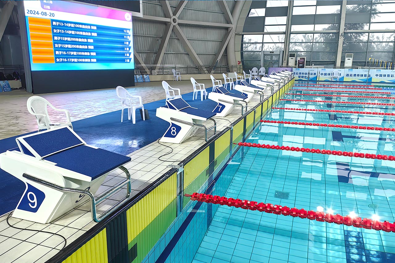823日, 2024年江蘇省青少年游泳錦標(biāo)賽 在連云港體育中心游泳館精彩謝幕。金陵體育作為本次賽事的器材供應(yīng)商和賽事服務(wù)商為本次賽事提供了計時記分系統(tǒng)、仲裁錄像系統(tǒng)、視頻直播系統(tǒng)等電子設(shè)備以及場地泳道線、出發(fā)臺等競賽器材。