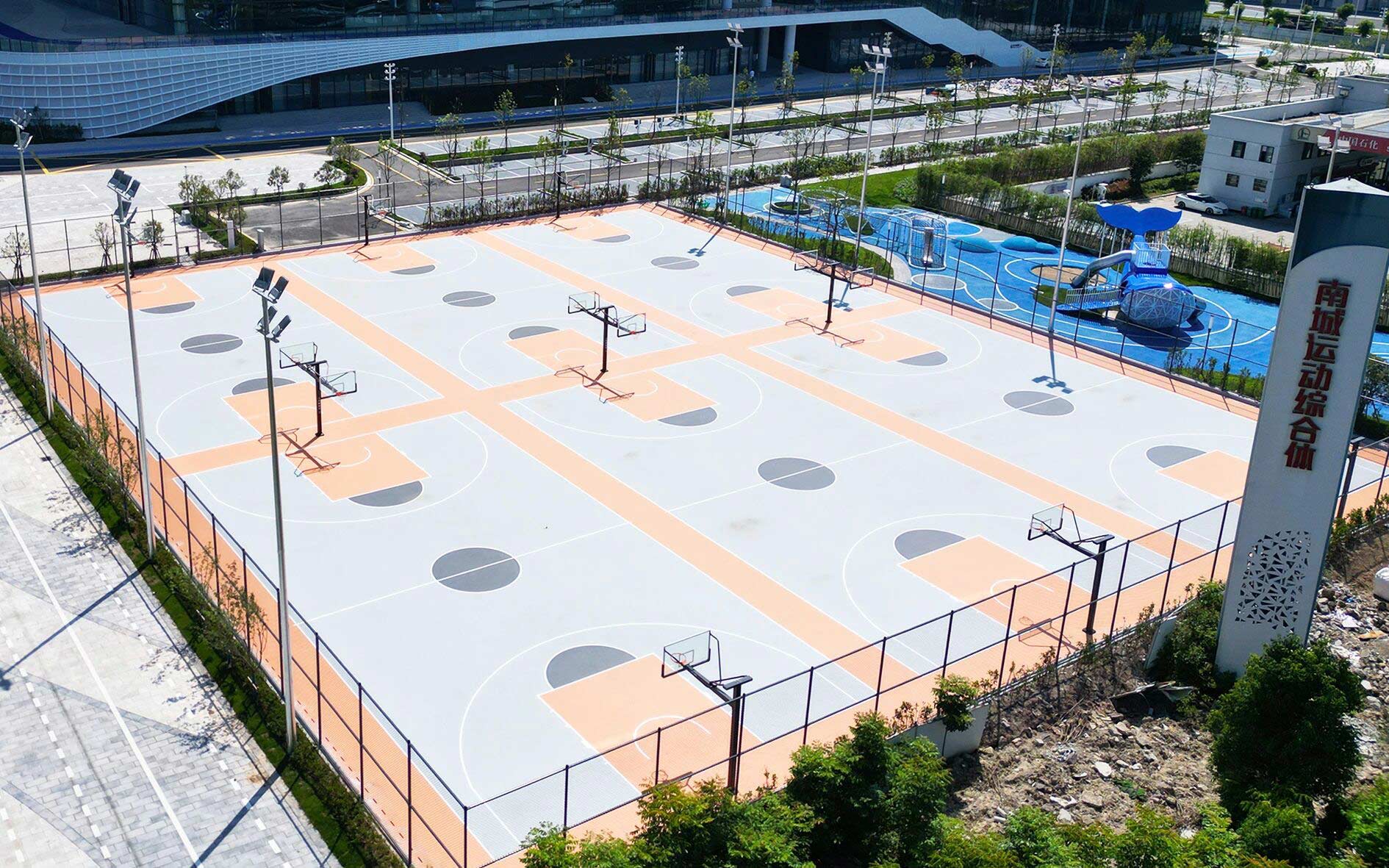 從高空俯瞰,這座 “五合一” 綜合性單體體育設施極具辨識度,囊括體育場、體育館、游泳館、輪滑館及網球館,集多元運動功能于一體,為當地群眾打造了一站式運動休閑新地標。