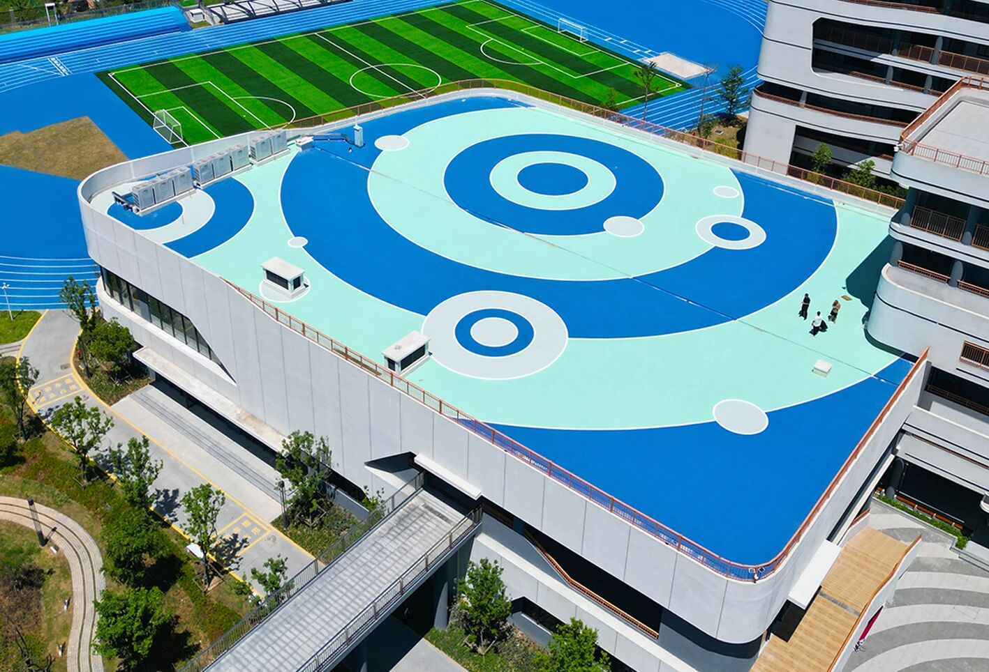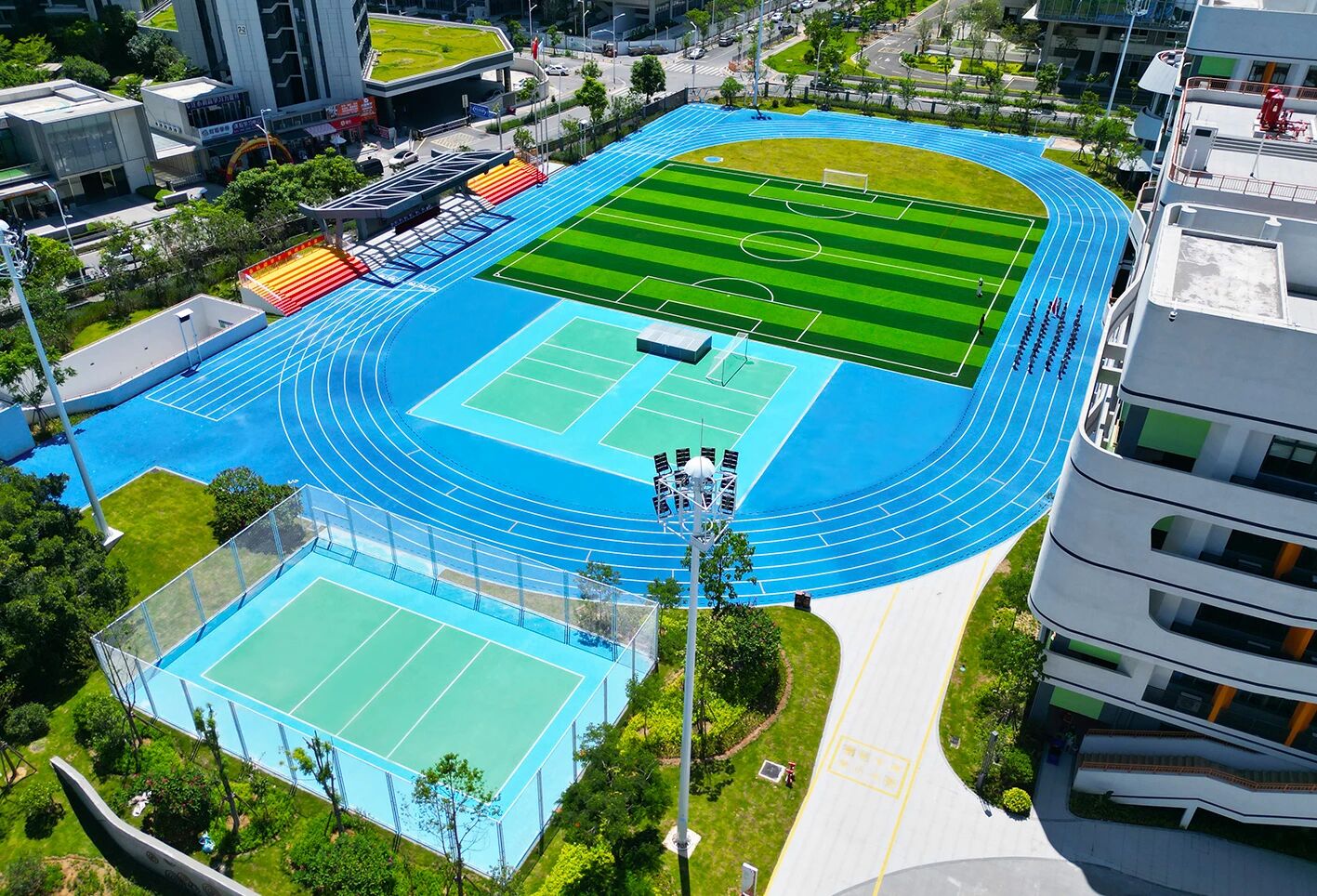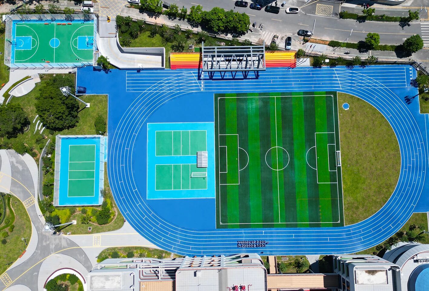 室外區域以籃球場、羽毛球場、網球場與全塑型自結紋塑膠跑道整體布局,兼顧不同年齡段學生的運動偏好,無論是籃球對抗,還是羽毛球對打,或是在跑道上馳騁,都能在此找到適配的場地。