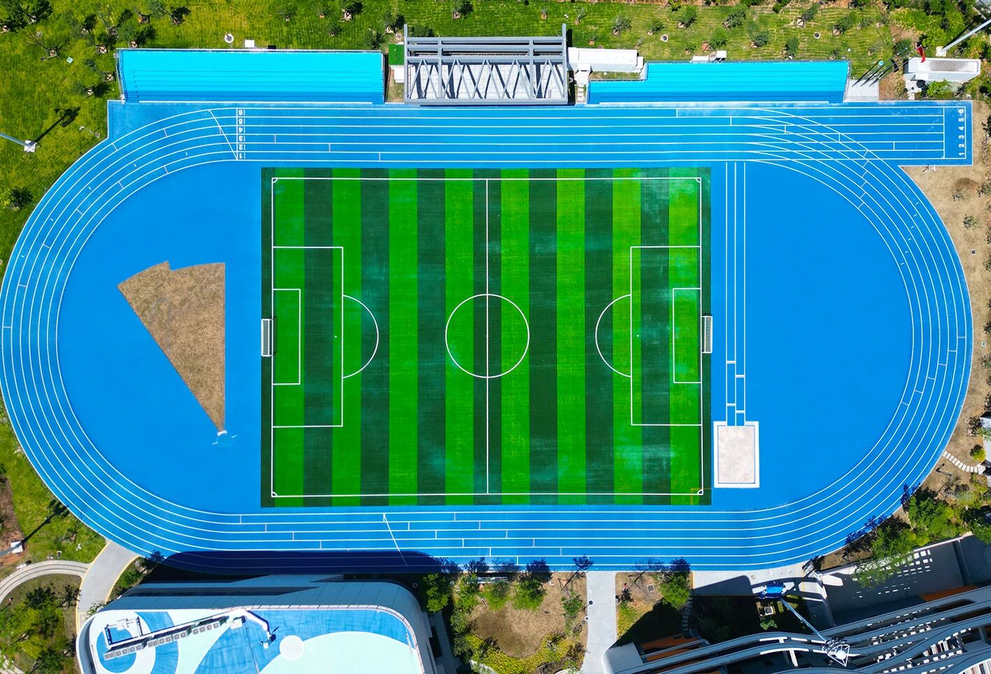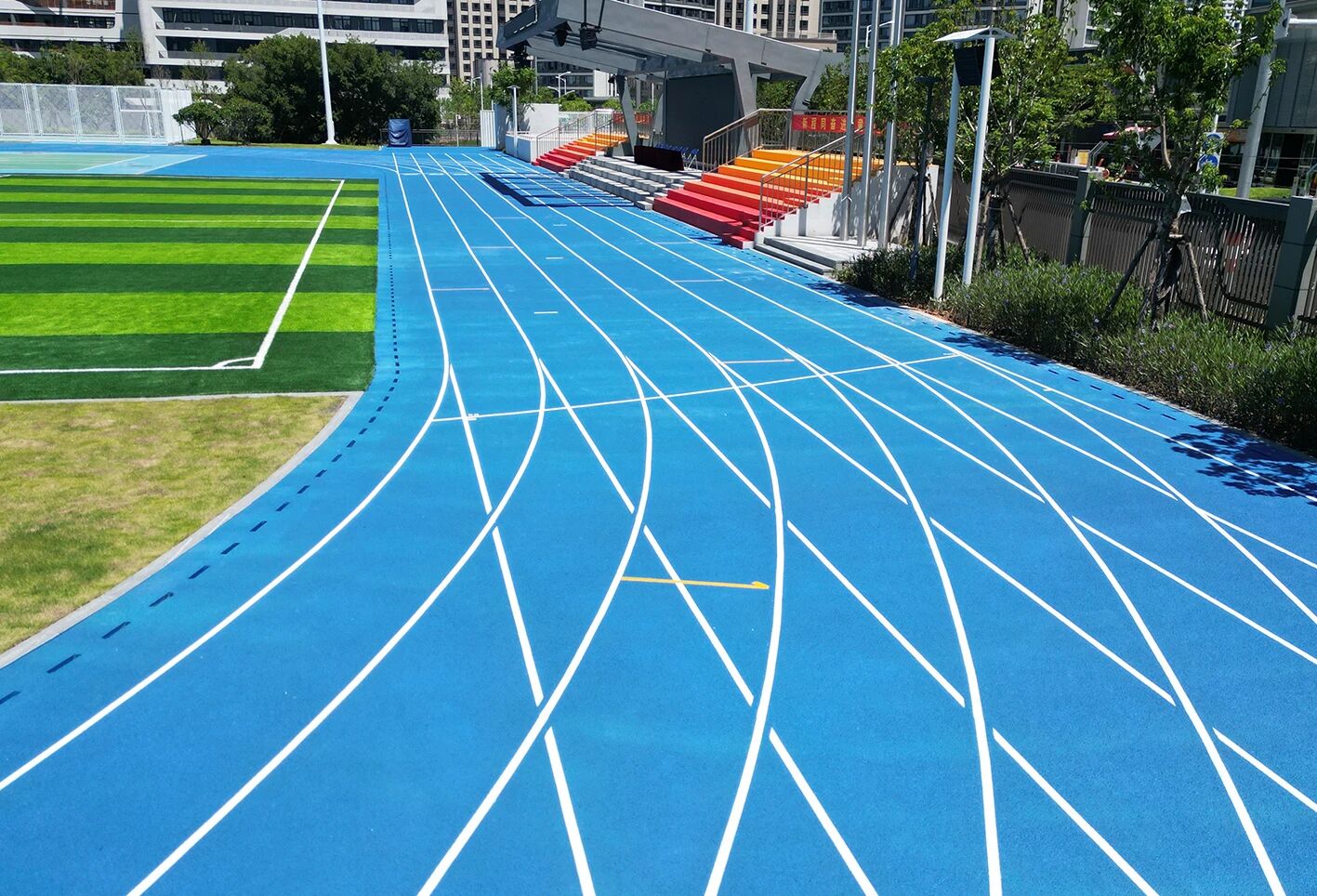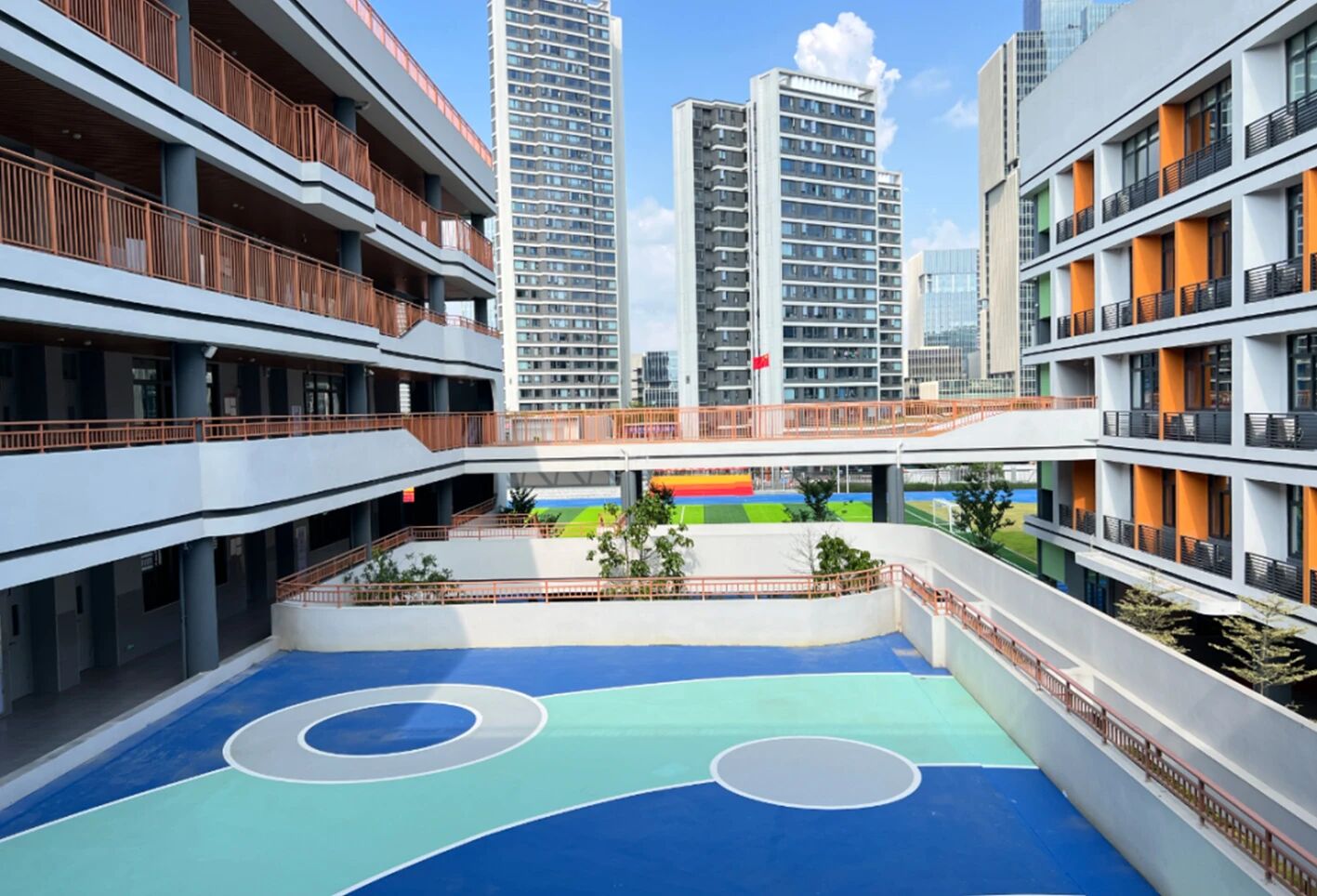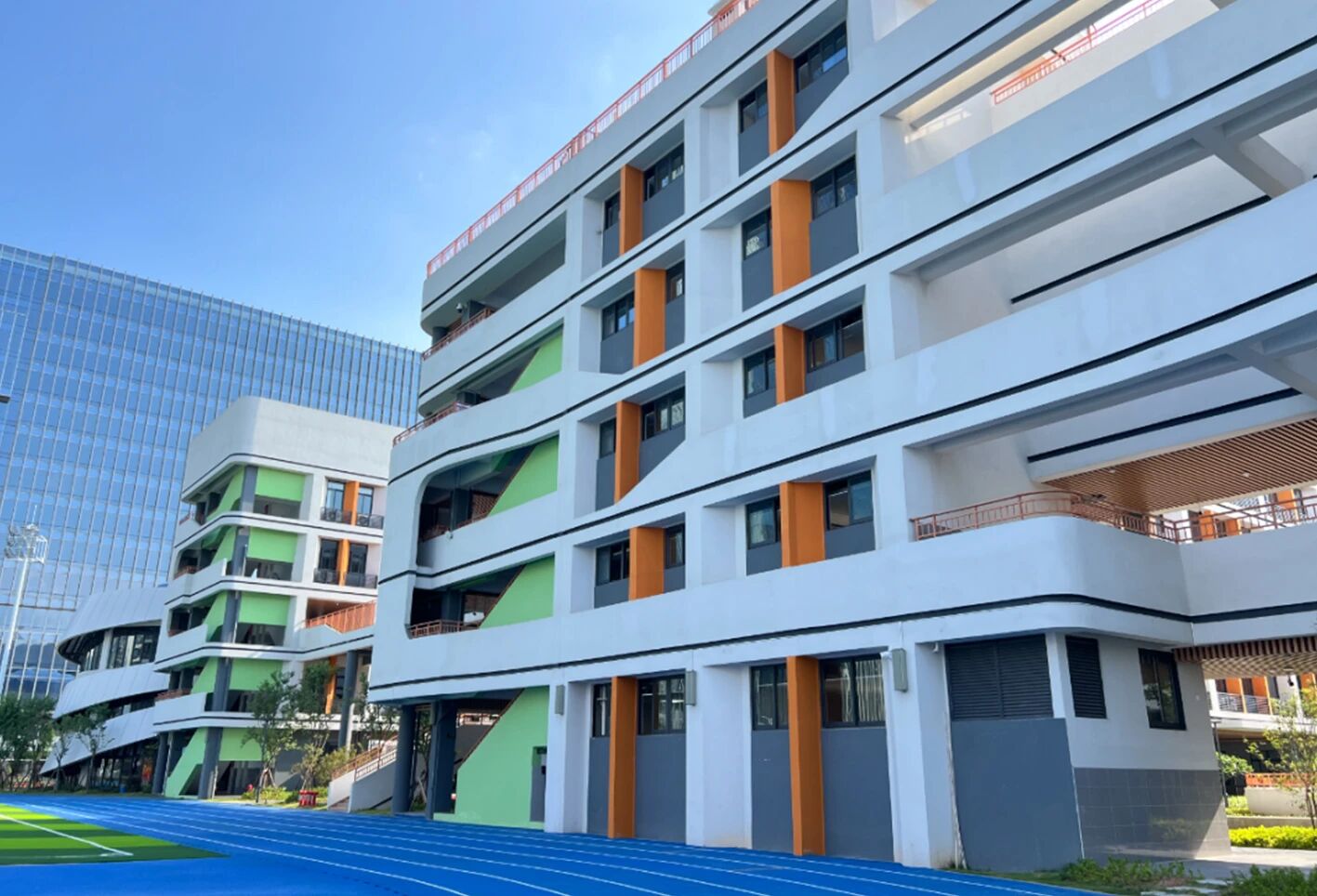 室外區域以籃球場、羽毛球場、網球場與全塑型自結紋塑膠跑道整體布局,兼顧不同年齡段學生的運動偏好,無論是籃球對抗,還是羽毛球對打,或是在跑道上馳騁,都能在此找到適配的場地。